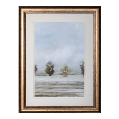 2,999 AEDA muted landscape is double-matted in white. Framed in a warm silver finish molding with ridged profile.