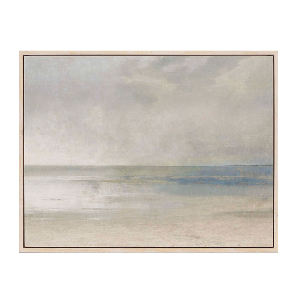 A tranquil seascape is mounted in a whitewash wood floater frame for a chic yet soothing interior.