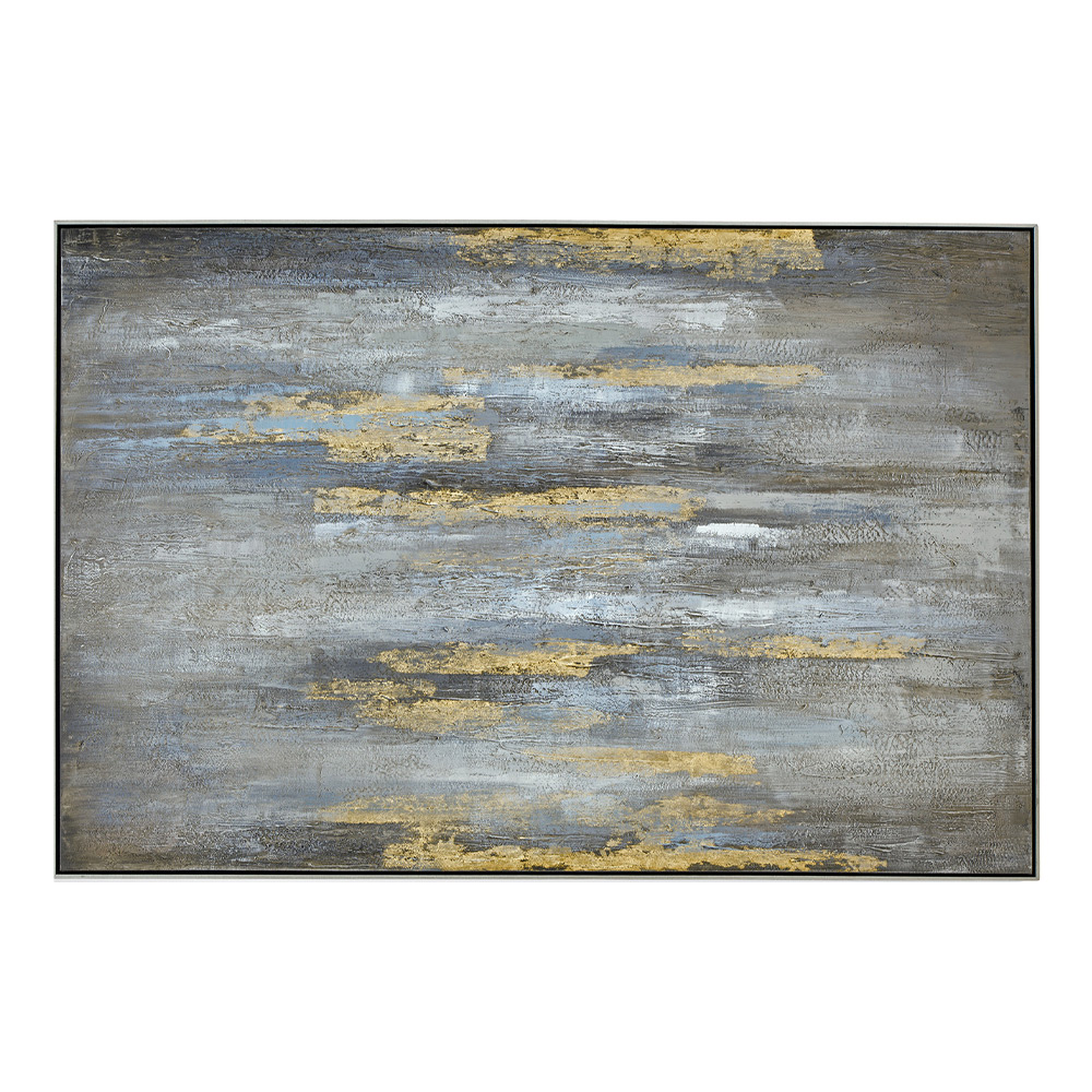 Reriz is a hand painted canvas including gold metallic foiled accents with a floating silver frame. The media features heavy layers of paint creating a uniquely textured canvas. D-ring or sawtooth picture hanging hardware included.