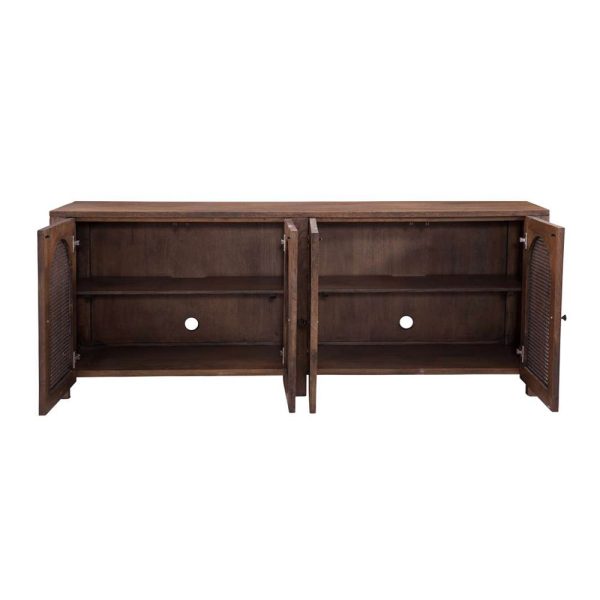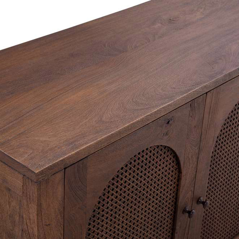 Introducing the Walsh Server, a blend of rustic modern farmhouse design that adds warmth to your space. Crafted from solid mango wood, it boasts a delicate antique walnut stain finish. The four doors feature arched open cane inserts for character. Inside, find practicality with two adjustable shelves and media cord management.