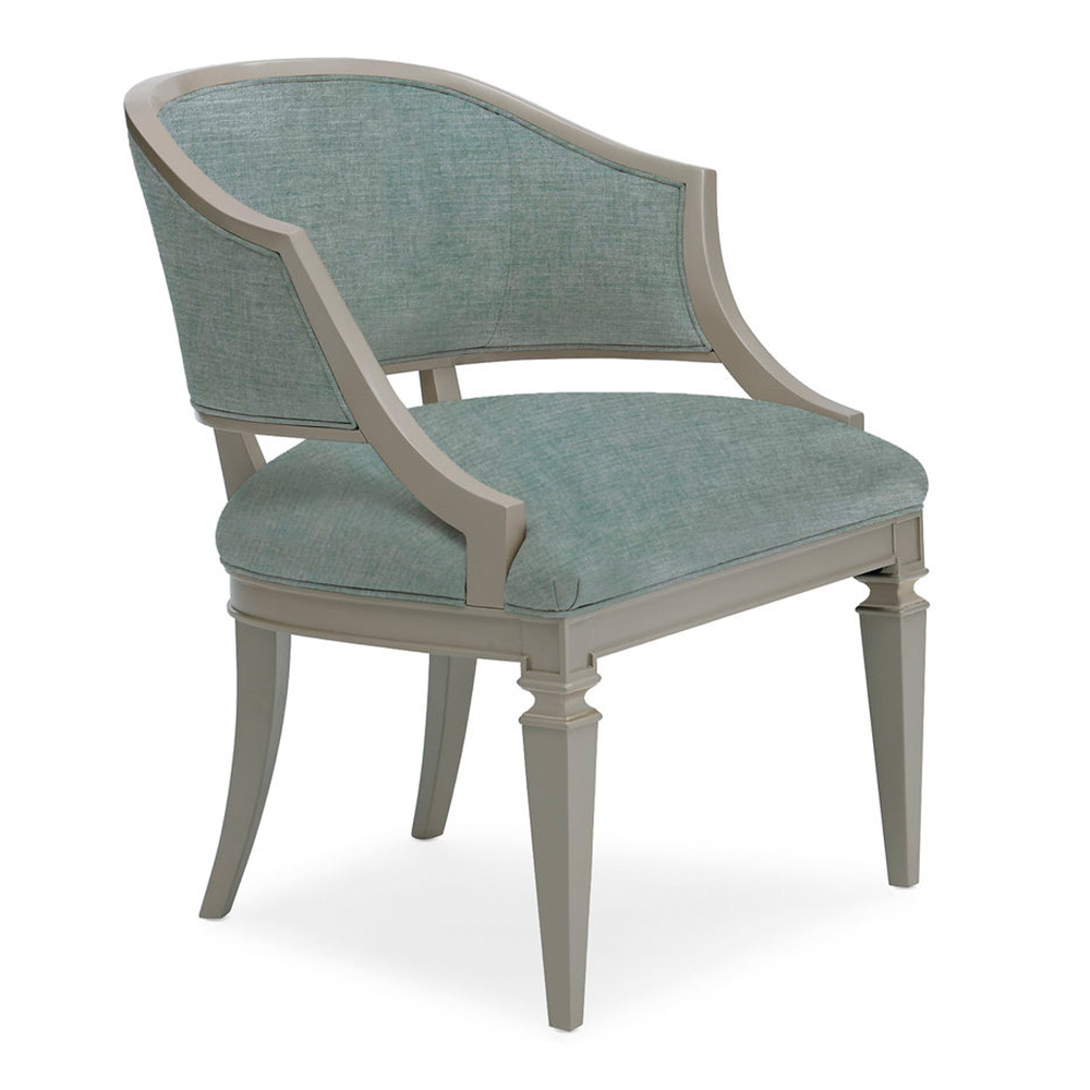 Inspired by classic French antiques, there’s no question of the elegance this chair imparts. A rich Radiant Pearl finish with Sparkling Argent highlights is featured on the exposed wood frame of its well-rounded silhouette. Its upholstered seat and back are tailored in a timeless linen blend fabric featuring a slim silver metallic yarn that gives it subtle overall reflectivity.