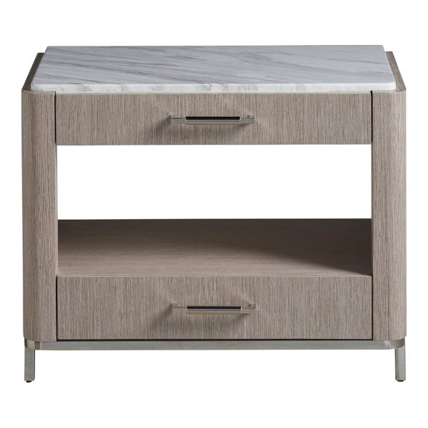 The Soren Bedside Table is a gorgeous marriage of texture and materials, featuring a stone top, sleek bar hardware and a metal base. It includes two spacious drawers and one open-air display shelf.