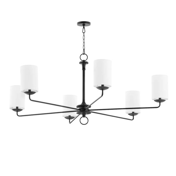 The Ginevra chandelier makes a powerful impact with its oversized spider-like silhouette. Six lights are cloaked by smooth, white fabric cylindrical shades. Ring details on the matte black frame support the overall composition by adding a layer of subtle style.