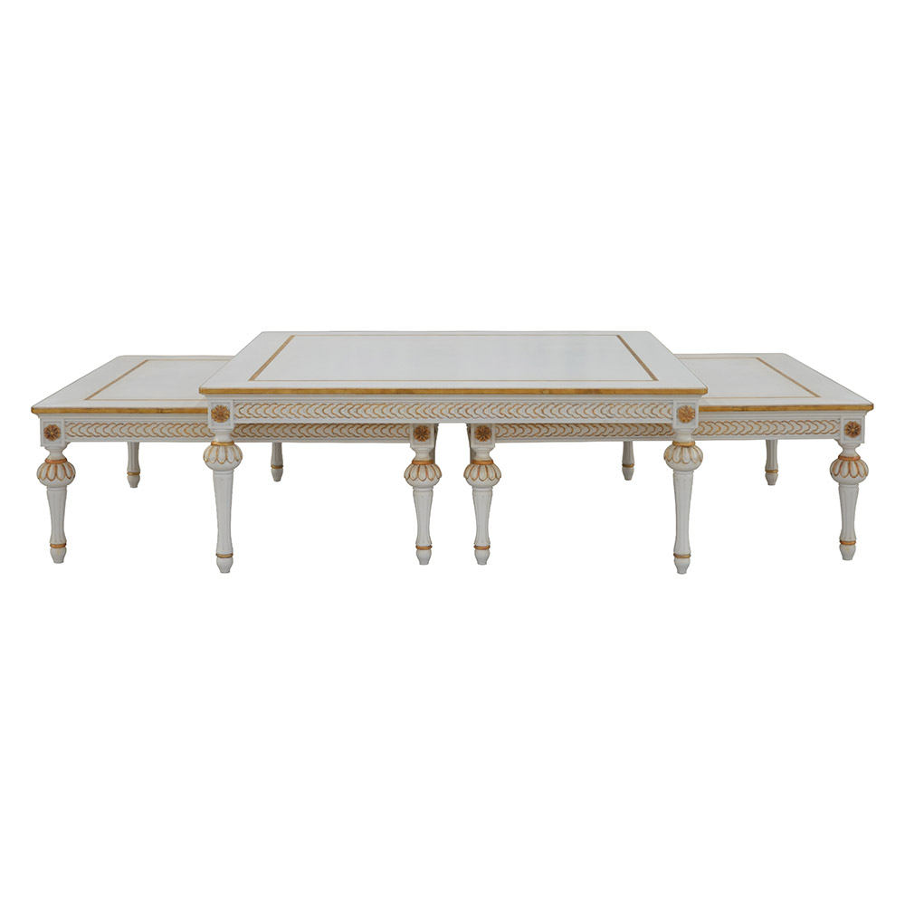 A unique twist on a classic design, the Donna Nesting French Cocktail table is perfect for updating any living space. This piece features a large surface and twelve engraved wooden legs in beautiful white finish.