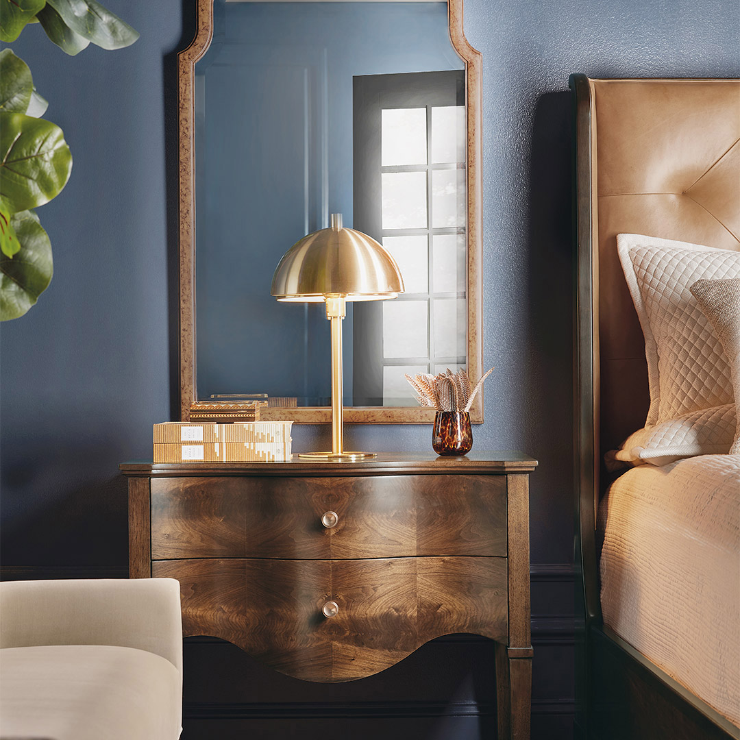The Archives Two-Drawer Nightstand blends refined design with practicality. With its serpentine shape, walnut swirl veneers, and scalloped drawer fronts, this nightstand is a standout piece. It features two drawers with oak veneer bottoms and elegant satin brass hardware, offering both beauty and ample storage for your bedside essentials.