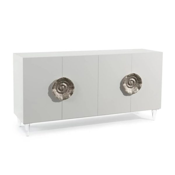 Standing on turned acrylic legs and finished in ice white, this four-door credenza has bold, silvered escargot handles on each pair of doors.