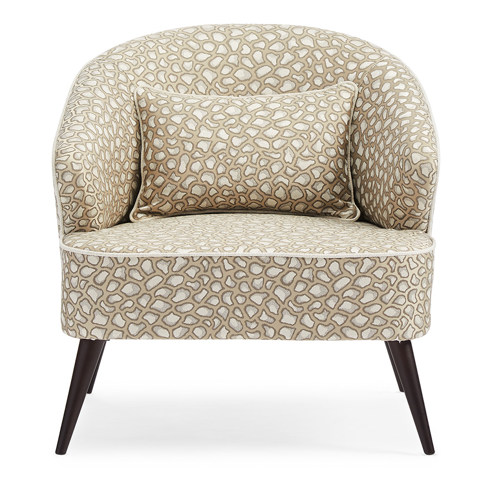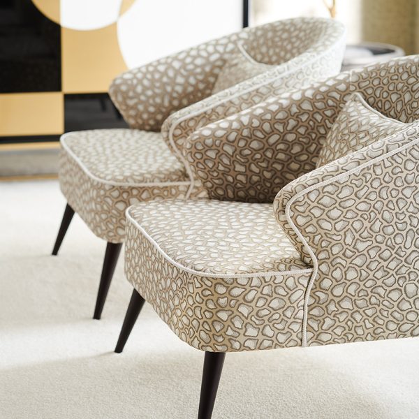 Often referred to as a salon chair, the Melanie chair is designed to be positioned in front of a lovely view without a direct line of sight into the dining area. It promises a smooth and relaxing transition from living to dining and again in reverse. It’s a lovely way to entertain and speaks to designer José Leite de Castro’s insightful understanding of what it means to fully embrace the role of host or hostess. Upholstered in an animal-inspired neutral embroidered fabric rendered in a shimmery golden-taupe hue, it’s perched atop Mid-century Modern angular wood legs. The chair’s flirty silhouette is further emphasized by a winter-white linen welt that outlines its curves. A smart little pillow created from the same fashionable print provides lumbar support.