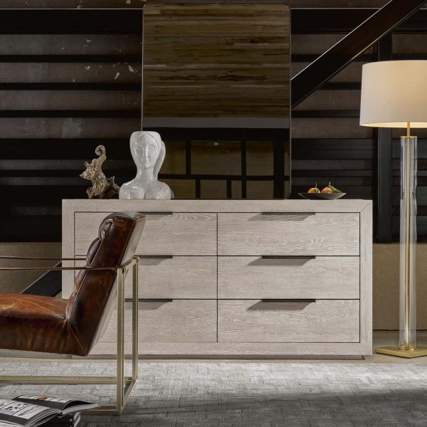 Defined by a clean Quartz-finished wood and textured bronze pulls, the Huston Dresser features six roomy drawers and convenient jewelry storage.