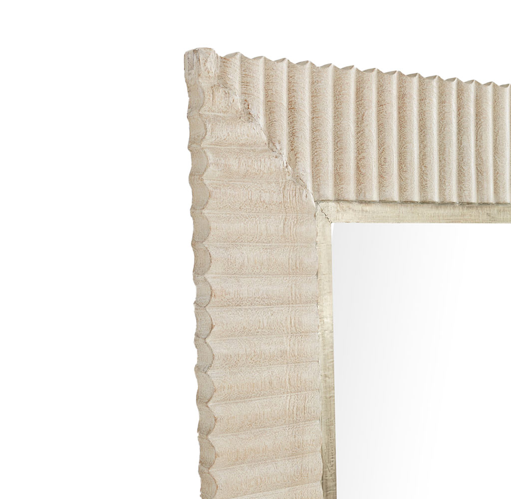 The Estriada family’s imaginative combination of cerused Mango wood and white metal gives the collection a signature feel. Hand-carved fluting is artfully applied to mitered Mango wood frames surrounding a crisp mirrored glass center. Hang over a bathroom countertop or in a living room to add warmth and depth. Available in three options.