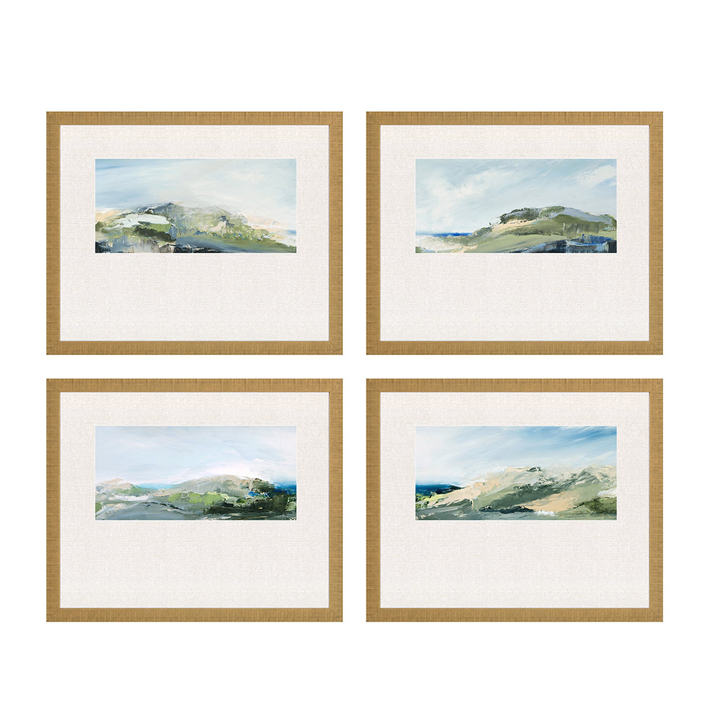 A contemporary landscape series is accented with offset premium matting. Framed in a ribbed molding in distressed gold.