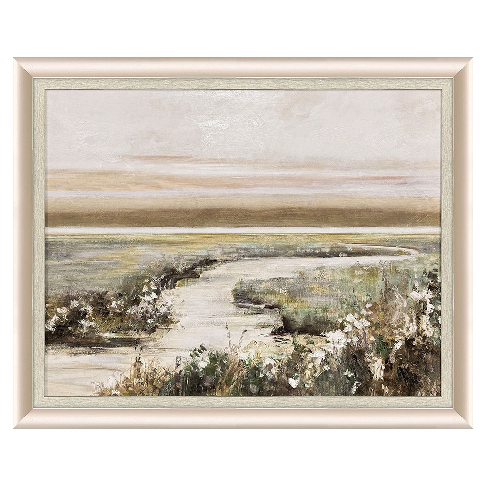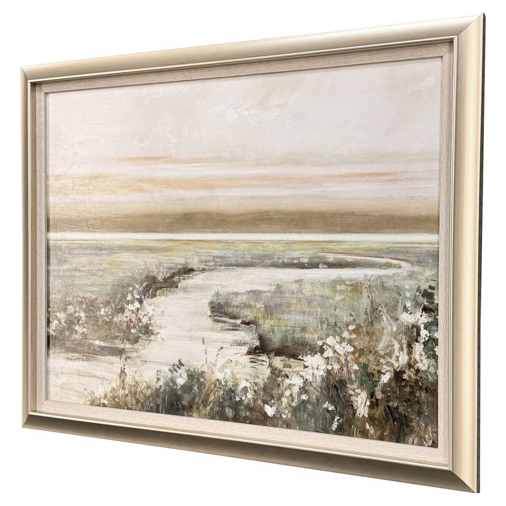 A tranquil horizon awakens in Eternity in Dawn Artwork, featuring a hand-applied enhanced gel finish that adds depth and radiance. The artwork is framed in a champagne gold moulding with a distressed whitewash liner, evoking quiet sophistication.