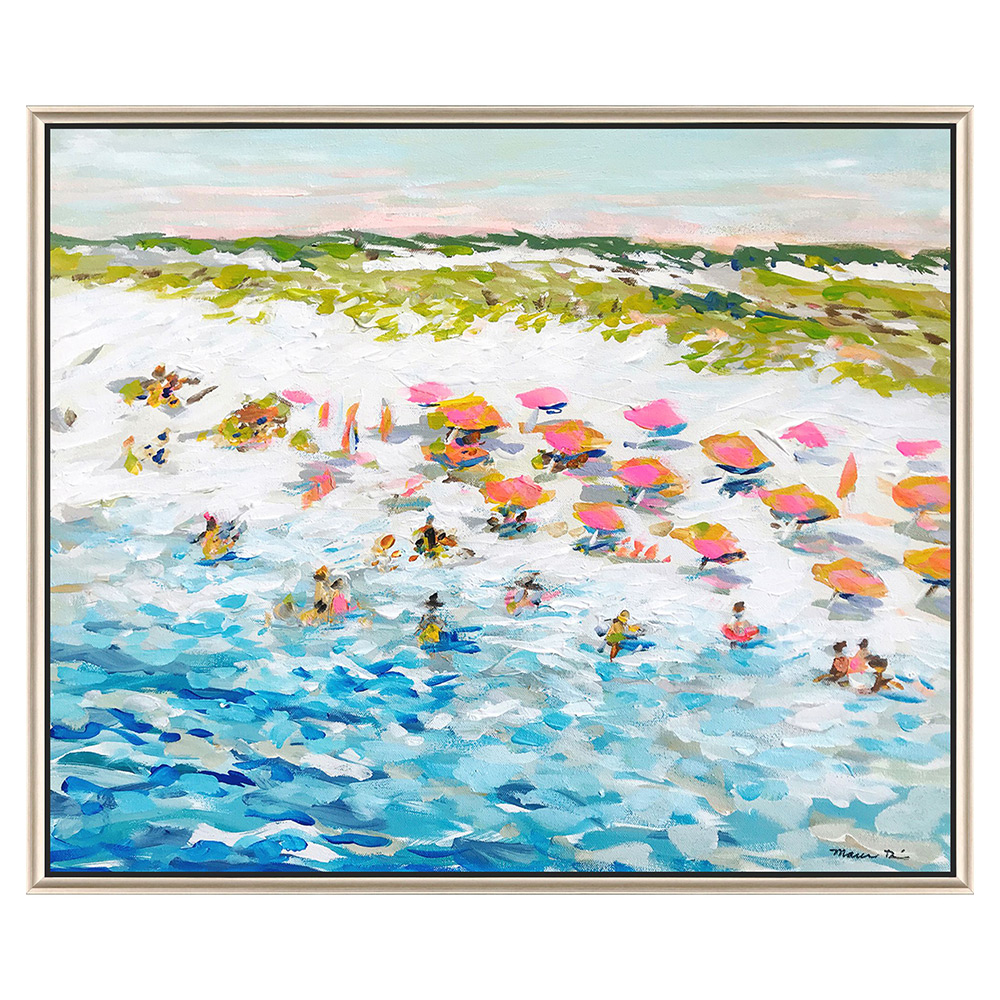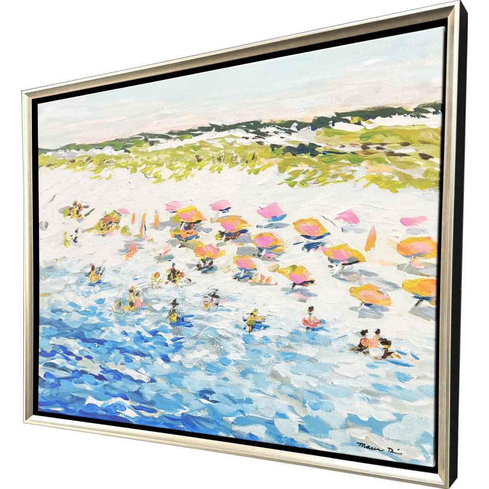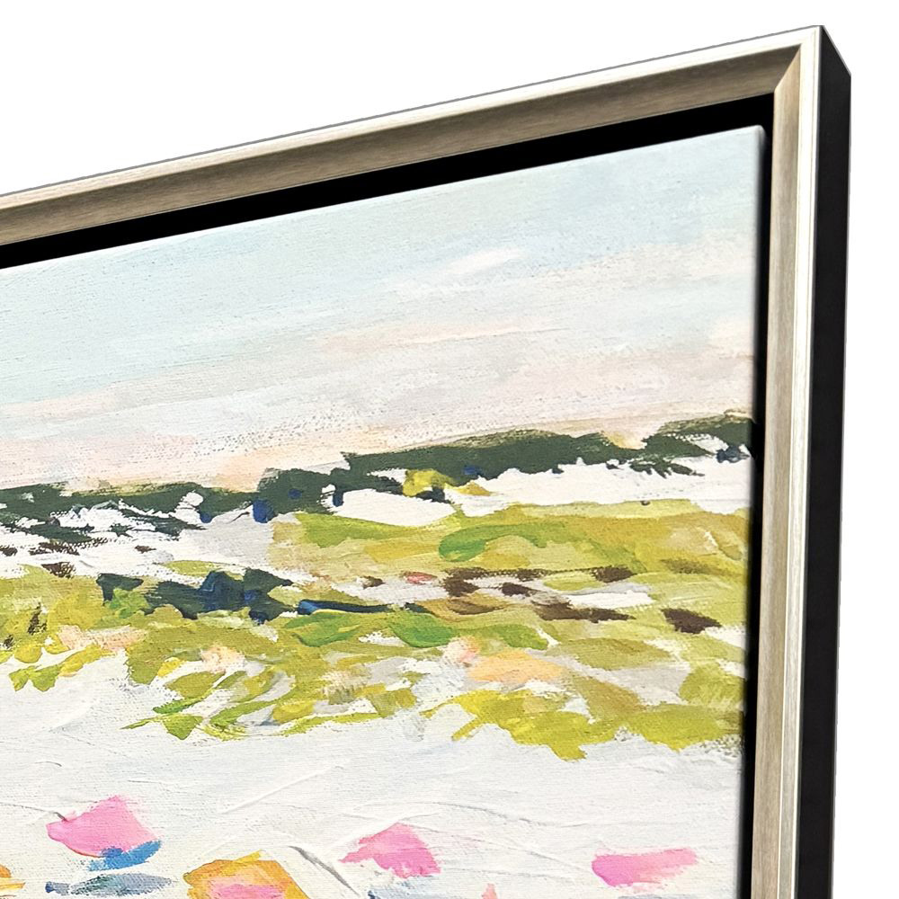 Magic Hour on the Beach Artwork captures the joy and warmth of a lively seaside afternoon, with figures playing in the sand and surf. The artwork is mounted on canvas and presented in a warm silver floater frame with satin black sides for a modern coastal finish.