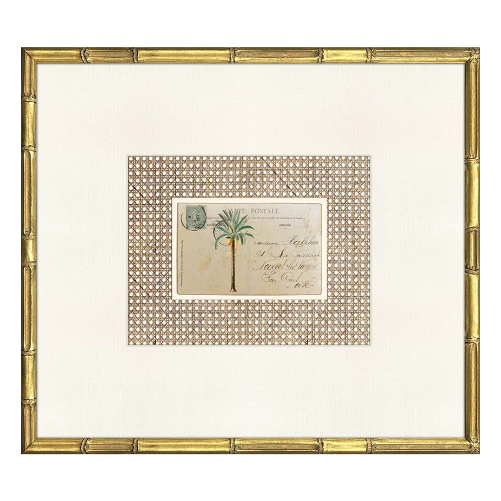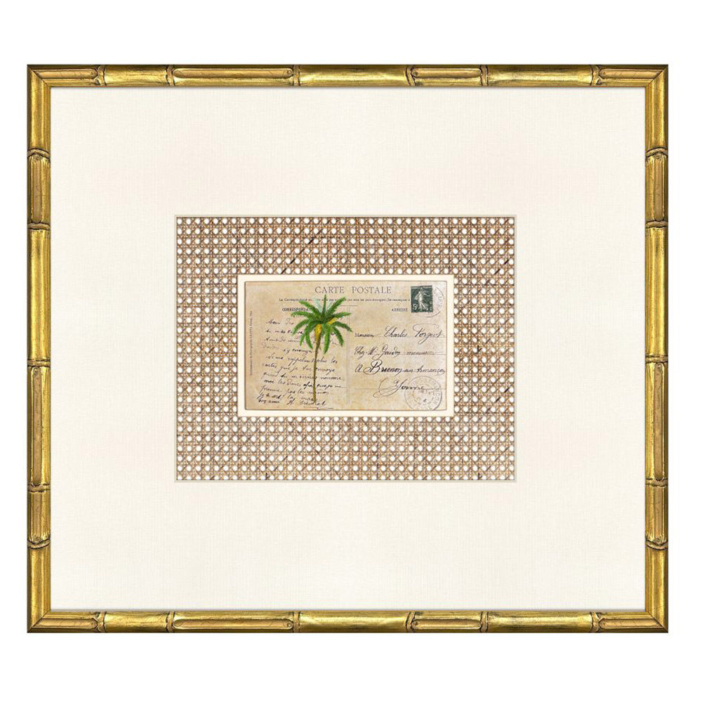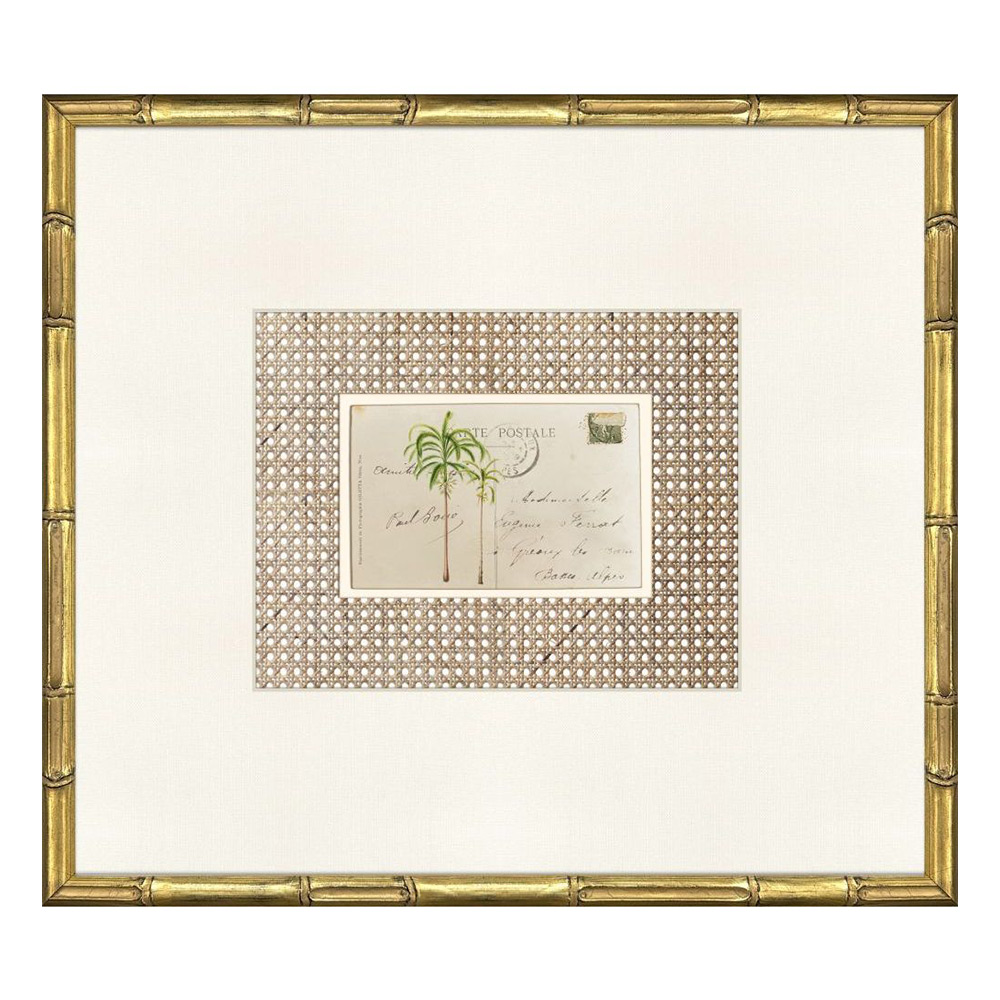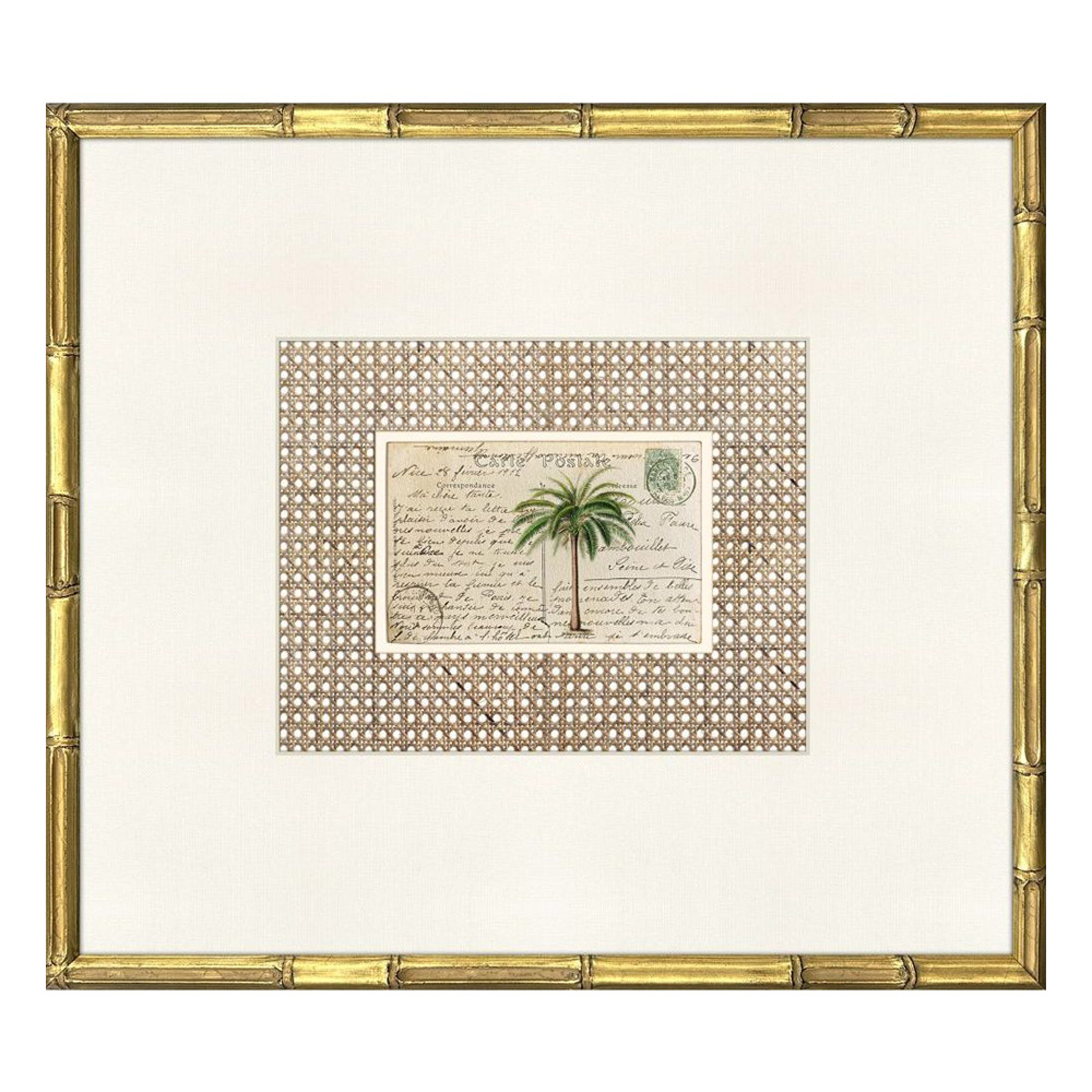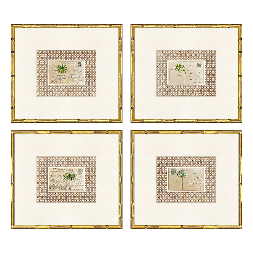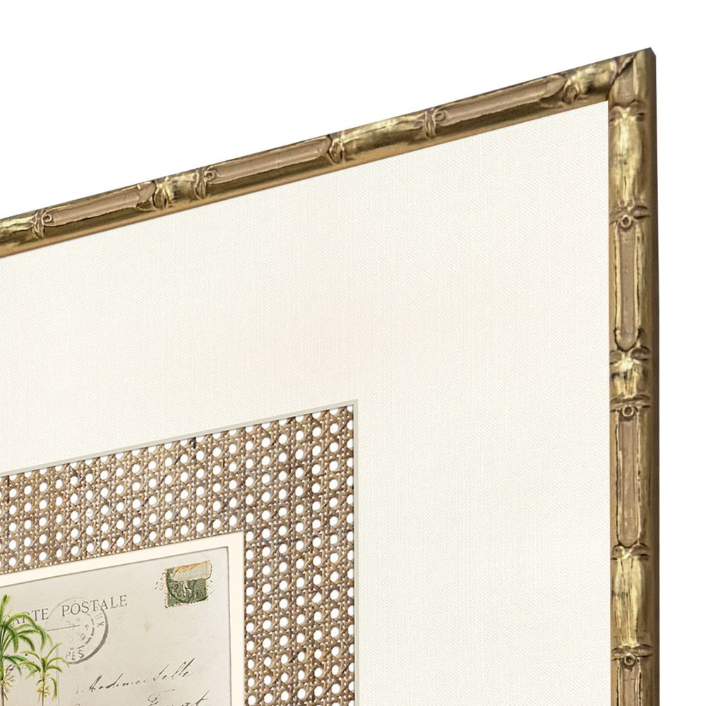 Palm Postale Artwork combines tropical motifs with vintage postcard charm. Each of the four prints features palms against a rattan-inspired background, paired with a linen-look ivory mat and framed in antique gold wood with bamboo embossing.