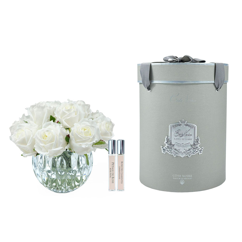 599 AEDThe Herringbone Flower Rose Buds Ivory White, a graceful blend of fragrant blooms and timeless elegance. Elevate your space with this exquisite collection, where purity meets sophistication in a radiant clear vessel.