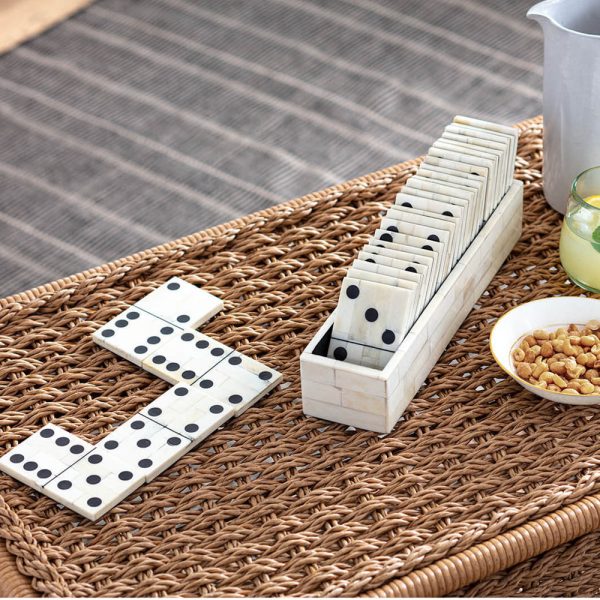 A beautiful piece of functional decor, this Domino Set is anything but ordinary. The domino pieces are real, white bone with black dots and their case is made from fragments of bone that have been shaped into tiles and inlaid by hand to create a rich mosaic look.