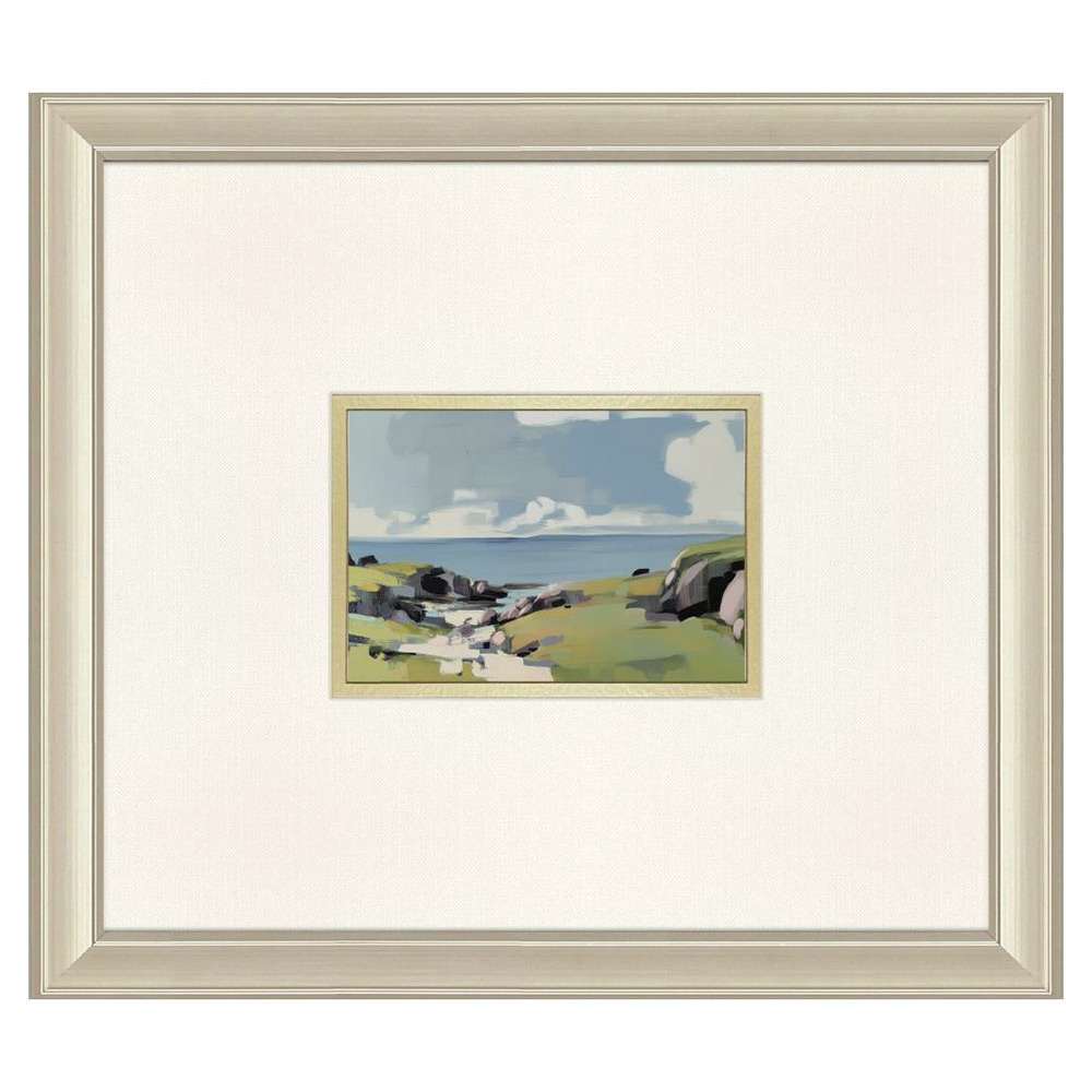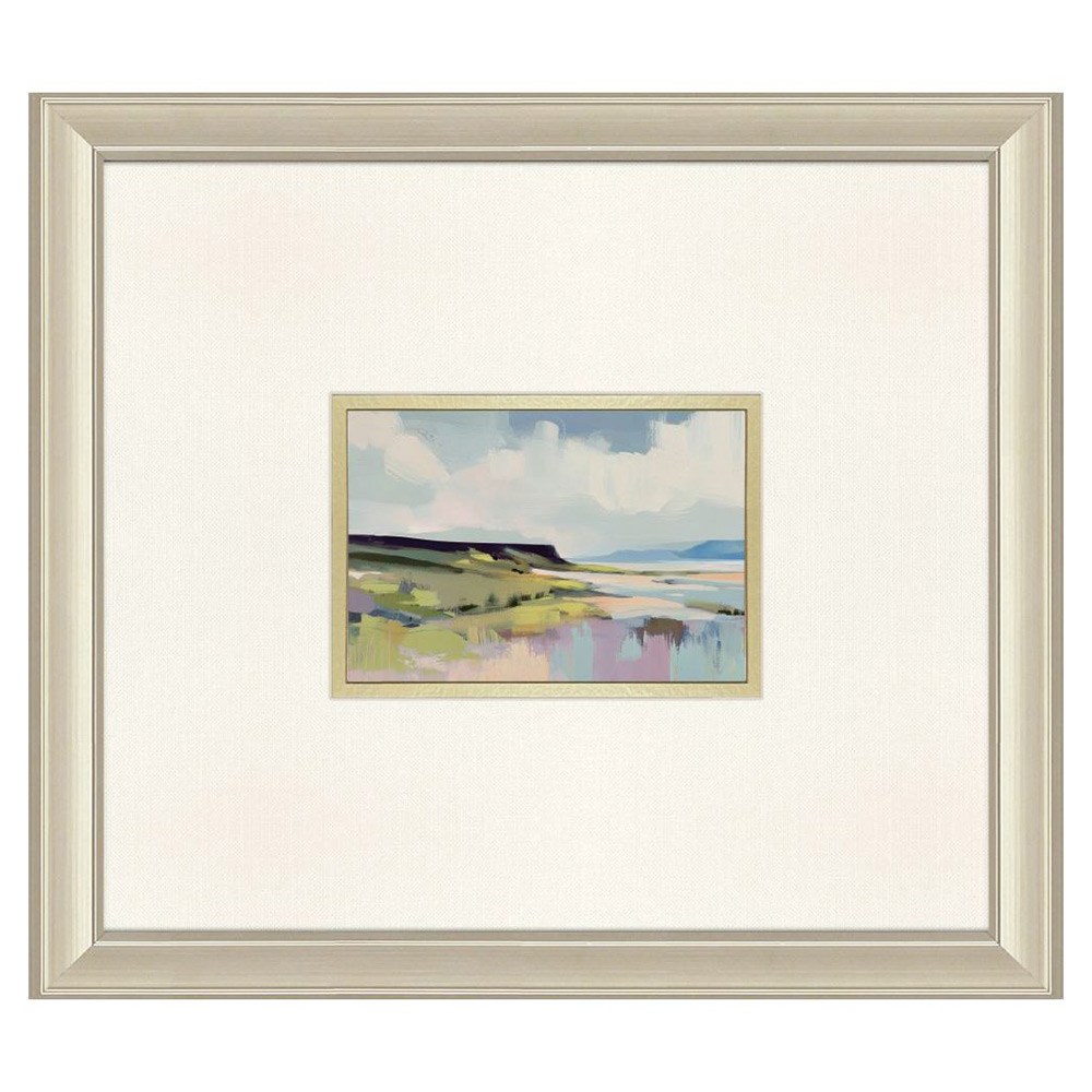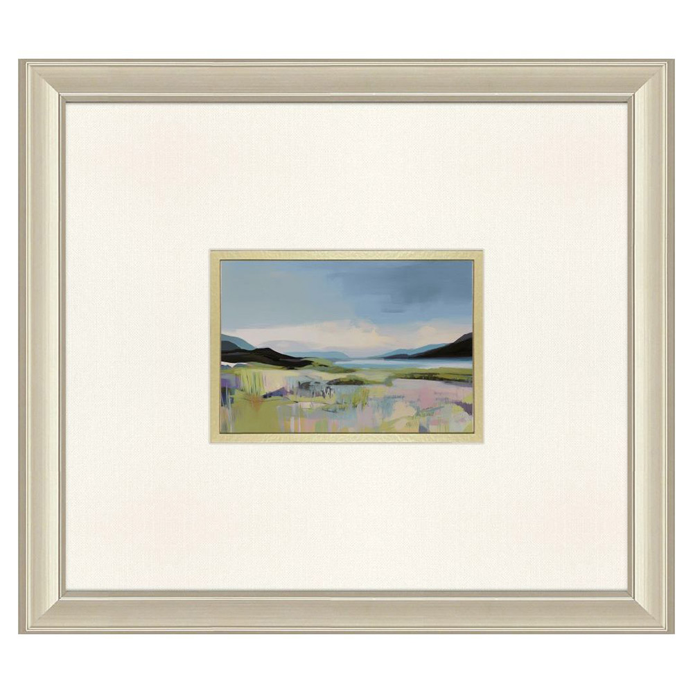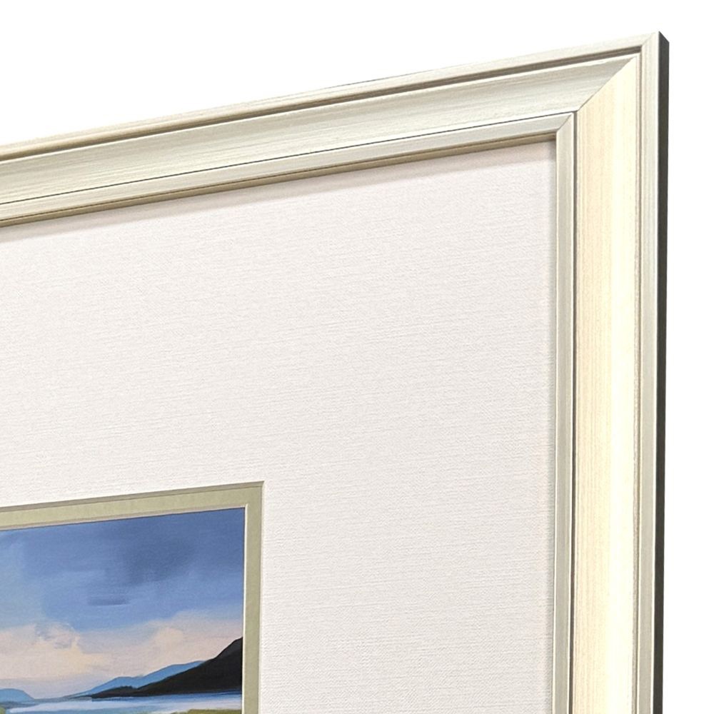 899 AEDA serene landscape offers a quiet, calming interlude. Matted in cream and framed in a brushed pewter finish moulding with silver lip.