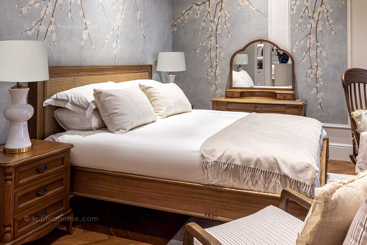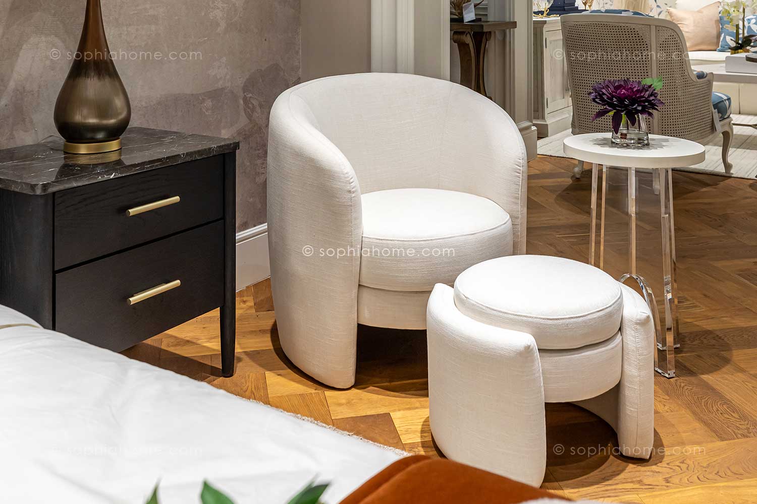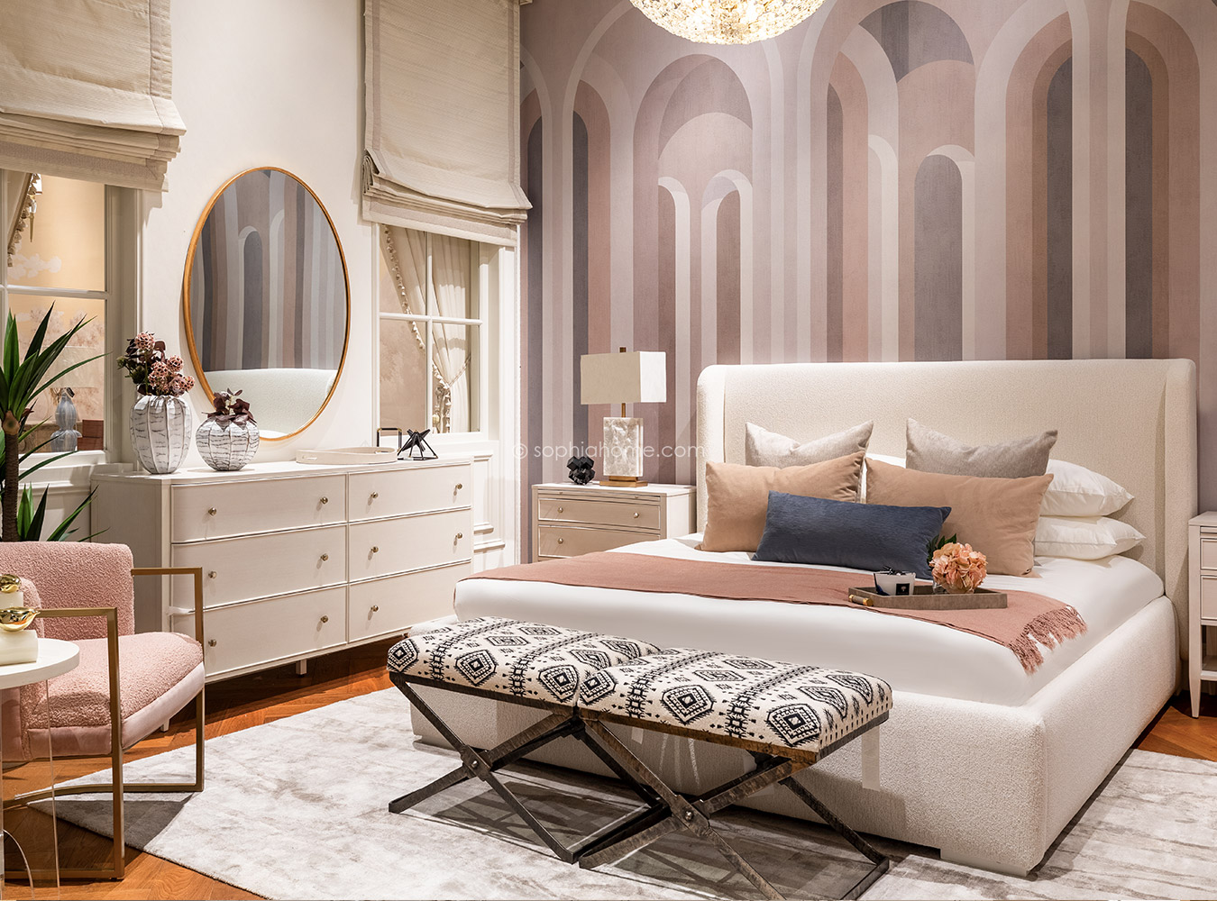 Sophia Home bedroom collection features elegant loose and hotel-inspired beds, accompanied by stylish nightstands, spacious dressers, upholstered stools, and antique mirrors. Each set, meticulously curated by Sophia Home interior designers, seamlessly blends style with functionality to complement your interior. Visit our showrooms at Galleria Mariyah Island, Abu Dhabi, and Dubai Hills Mall, Dubai, to discover a wider selection of chic bedroom collections.